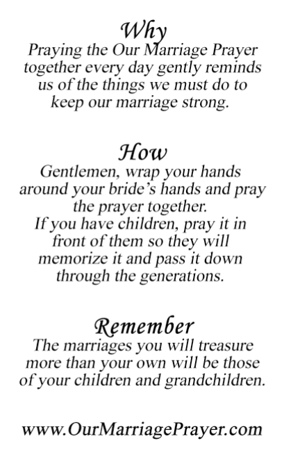 It is a beautiful prayer that reminds the couple what they must do every day to keep their marriage strong. Most importantly, it asks God to protect the marriage by placing it safely in His hands. Here is the front and back of the English Our Marriage Prayer card. They are approximately 3" x 5".